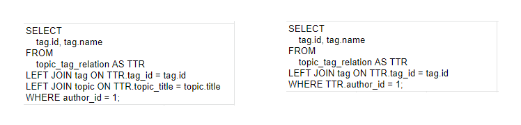 topic_tag_relation 테이블에 author_id 컬럼을 추가해서 조회할수 있도록 하면 JOIN을 줄일 수 있다.