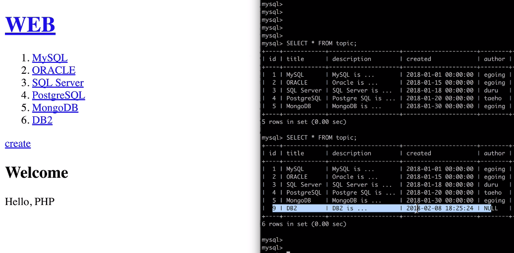 SELECT * FROM topic ORDER BY id DESC; //작은 순으로 정렬은 ASC;