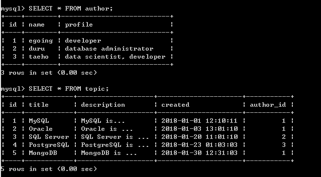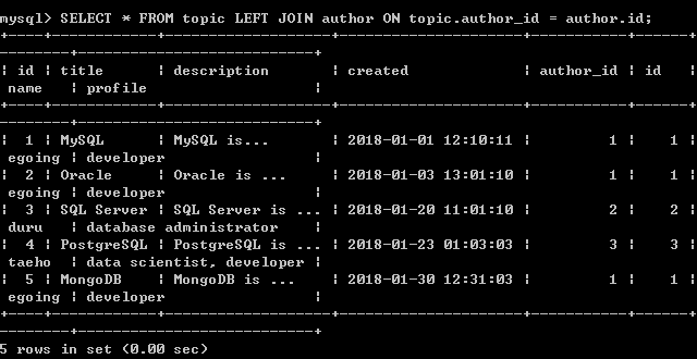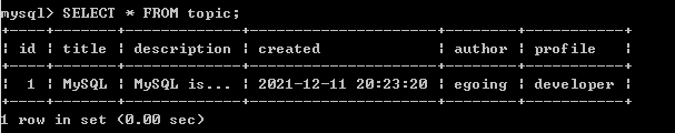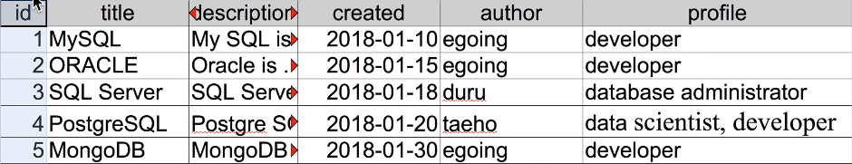 topic 테이블에 추가한 id, title, description, created, author, profile 컬럼의 상태를 확인할 수 있다.