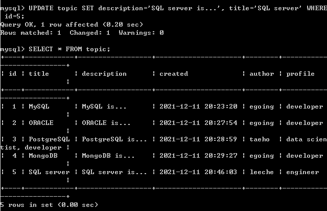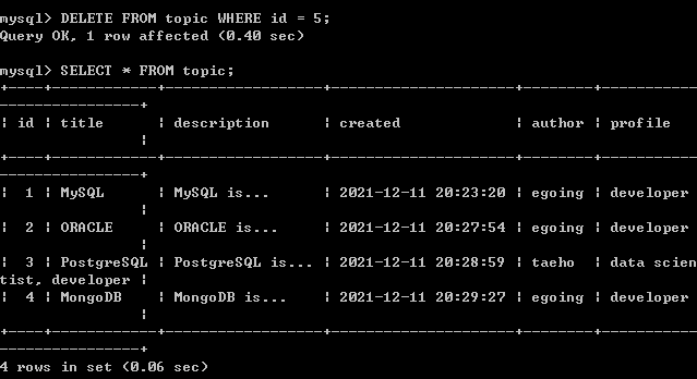 WHERE id = 5; 로 id가 5번인 행을 삭제하였다.