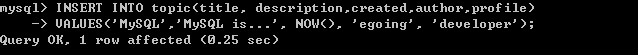 MySQL에 대한 데이터를 테이블에 추가하였다. NOW()는 현재 시간을 뜻하며