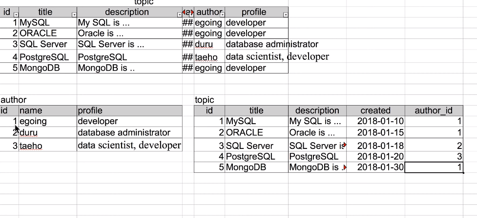 기존에 이렇게 분리되어 저장된 topic과 author 테이블은
