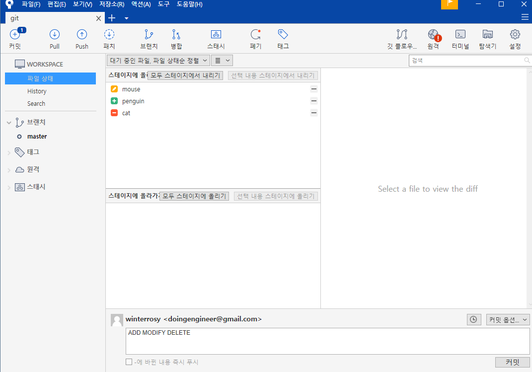 폴더를 선택하고 그 안에 파일 cat, mouse를 만들면 소스트리는 해당 화면이 나타난다.