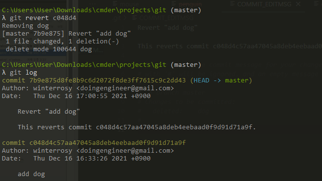 이후 추가하였던 penguin 파일이 삭제되고, 삭제한 cat파일이 생겨난 것을 확인할 수 있다.