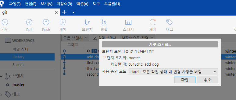 소스트리에서는 같은 방법으로 히스토리 -> 오른쪽 클릭 -> 이 커밋 초기화 선택
