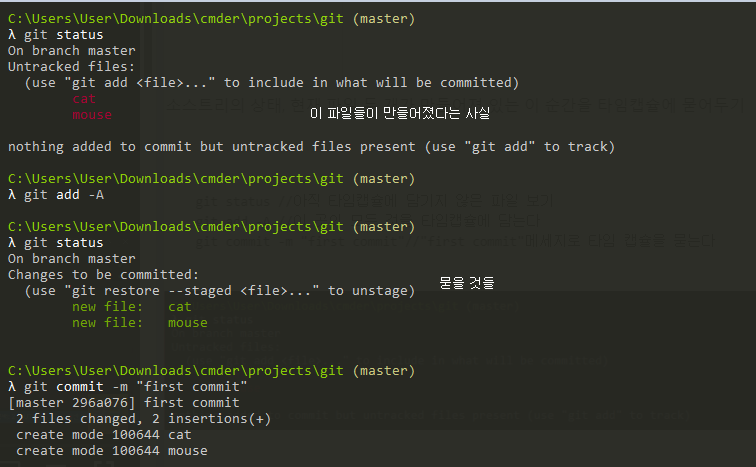 git commit -m "first commit"//"first commit" 설명과 타임 캡슐을 묻는다