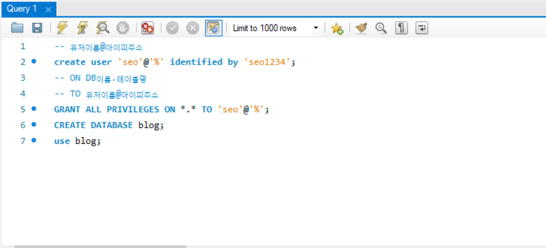 우선 mysql의 workbench에 root를 추가하고 아래와 같이 작성한다.