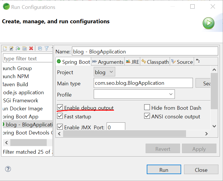 run configurations에 Enable debug output 체크