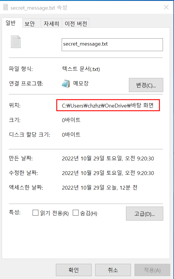 혹은 바탕화면에 파일을 생성한 경우에는 파일의 속성 -> 위치를 확인하여 경로를 적어줄 수 있다.
