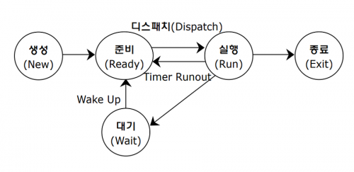 | 대기→준비(Wake up) | 입출력이 완료되거나 자원이 할당되어 다시 실행 |