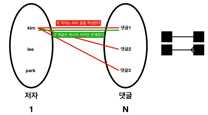 저자는 여러 개의 댓글을 작성할 수 있다. 저자에게 댓글은 여러개이다.