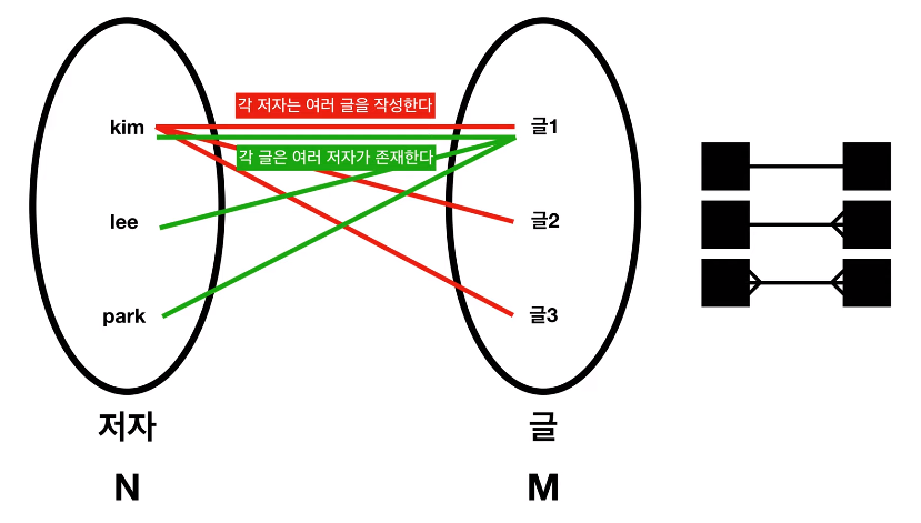 이러한 관계를 N:M(다:다) 관계라고 한다.