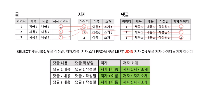 저자 테이블과 댓글 테이블은 각각 세개의 행을 가진다.