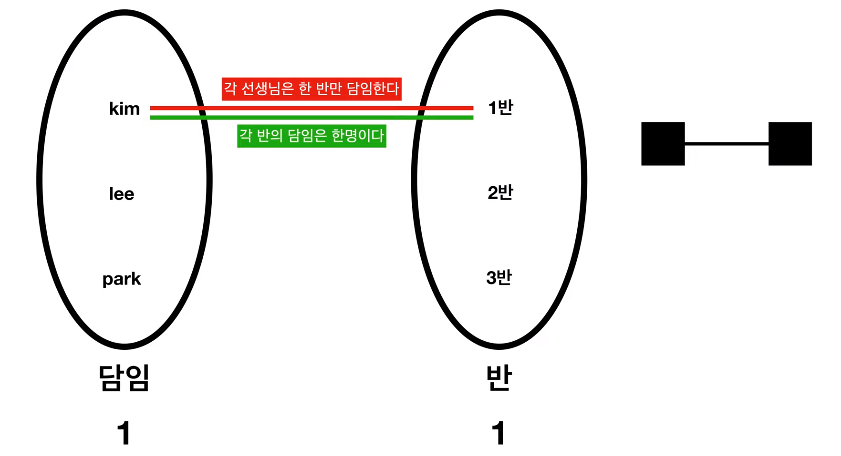 각 선생님은 한 반만 담임을 한다 -> 담임은 반을 한개만 가질수 있다, 담임에게 반은 한개다.