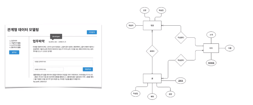 - 기획서를 보면 제일 먼저 하는 일은 기획서에서 Entity를 찾아내는 것이다. 연관된 데이터를 그룹핑하는 엔티티를 만들며 이것은 네모로 표현한다.