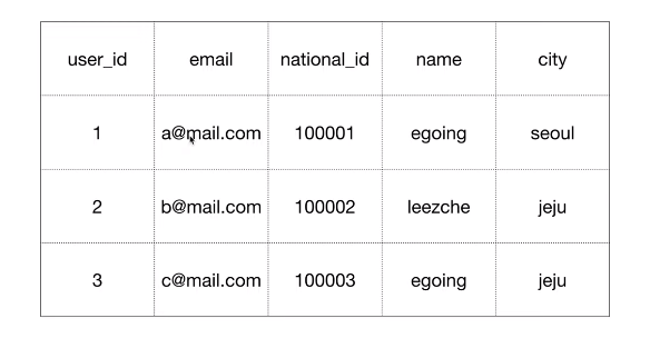 해당 테이블에서 식별자로 사용할 수 있는 컬럼은 'user_id, email, national_id'이다. *고유한 값을 가지는 컬럼