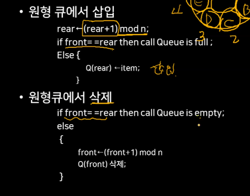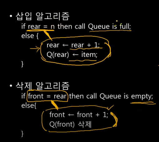 만약 front=rear이면 큐가 비어있는 것입니다. 이때는 삭제 연산을 할 수 없습니다.
