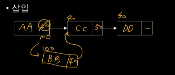 연결리스트 최대 장점은 삽입, 삭제가 편리하다는 것입니다, 주소가 100번지인 데이터 BB를 삽입을 하고 싶다면, AA가 40을 가리키고 있었다면 지우고 100을 가리키게 합니다.